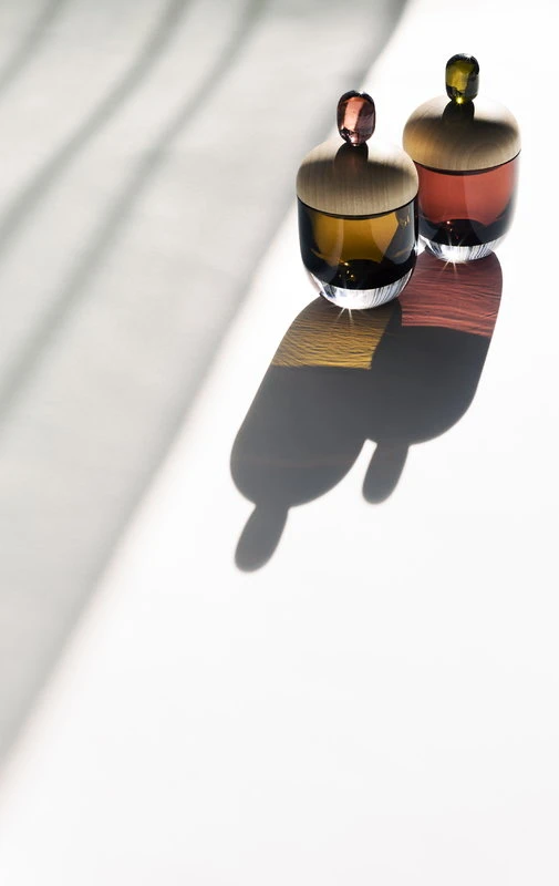 Les adorables boîtes Lyyli de Katriina Nuutinen associent les traditions du soufflage de verre et de l’artisanat du bois finlandais sous une forme charmante et moderne. En verre soufflé et coloré, la boîte est dotée d’un couvercle en bois rond, cerise sur le gâteau, d’un petit bouton en verre au coloris magnifique. L’association de bouleau clair et de verre brillant est charmante et ludique et elle est sublimée dans un ensemble de plusieurs boîtes différentes. Mesurant 6,5 cm de diamètre, les boîtes Lyyli peuvent être remplies de pastilles, d’accessoires en papier, de trombones, de bijoux et autres petits trésors.